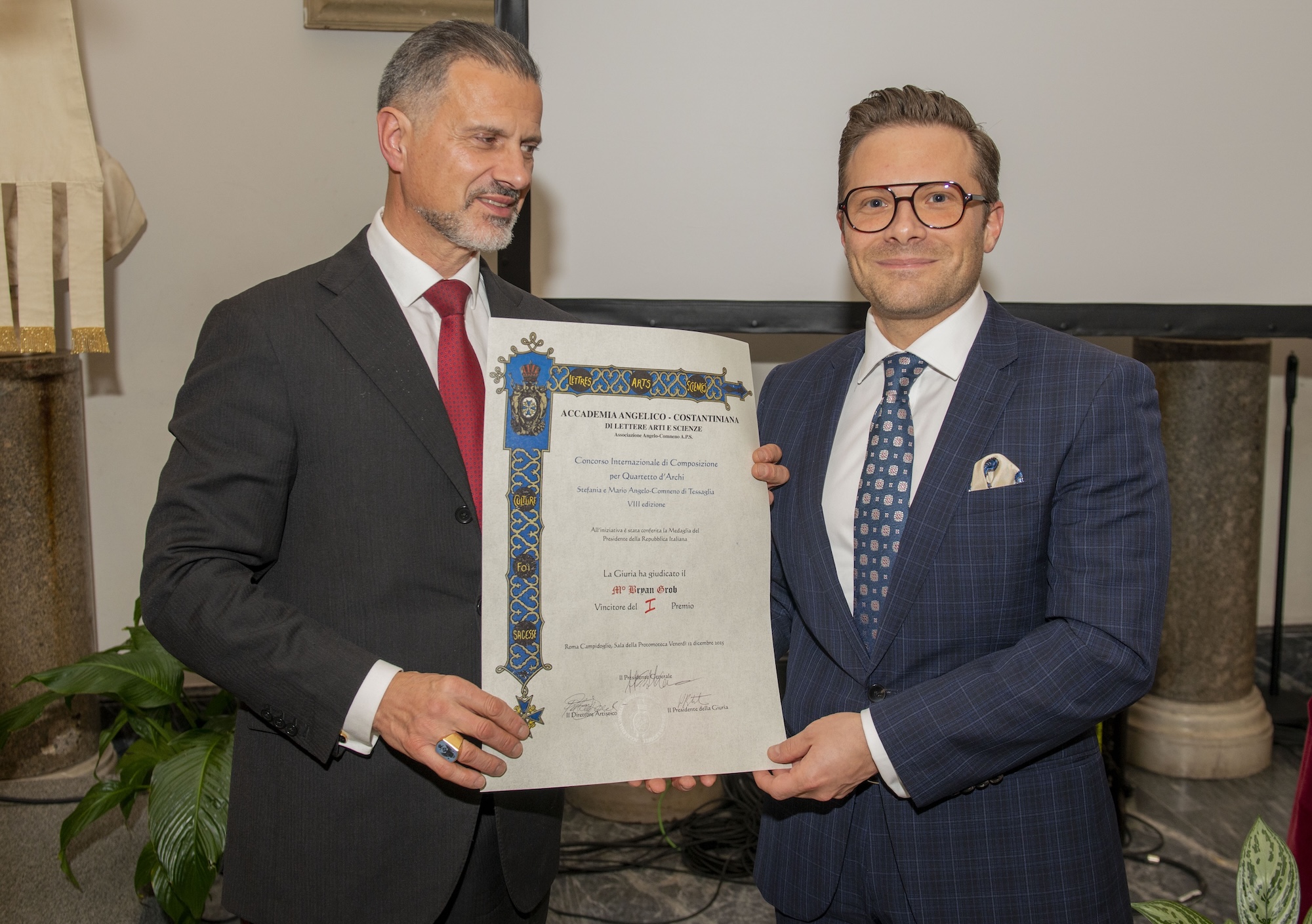 Roma, 15 dicembre 2025 - Bryan Grob ha vinto l’VIII edizione del Premio “Mario e Stefania Angelo-Comneno” con la sua opera dal titolo “Ex Multis”. Si è conclusa venerdì 12 dicembre in un clima di grande entusiasmo l'VIII edizione del Concorso Internazionale di Composizione, bandito dall'Accademia Angelico-Costantiniana di Lettere, Arti e Scienze, che si è svolto nella prestigiosa Sala della Protomoteca in Campidoglio a Roma. Il Progetto è stato ideato e realizzato nella sua forma attuale dal Direttore Artistico dell’Accademia Angelico-Costantiniana, M° Patrizia Barrilà, con il contributo del M° Claudio Perugini.