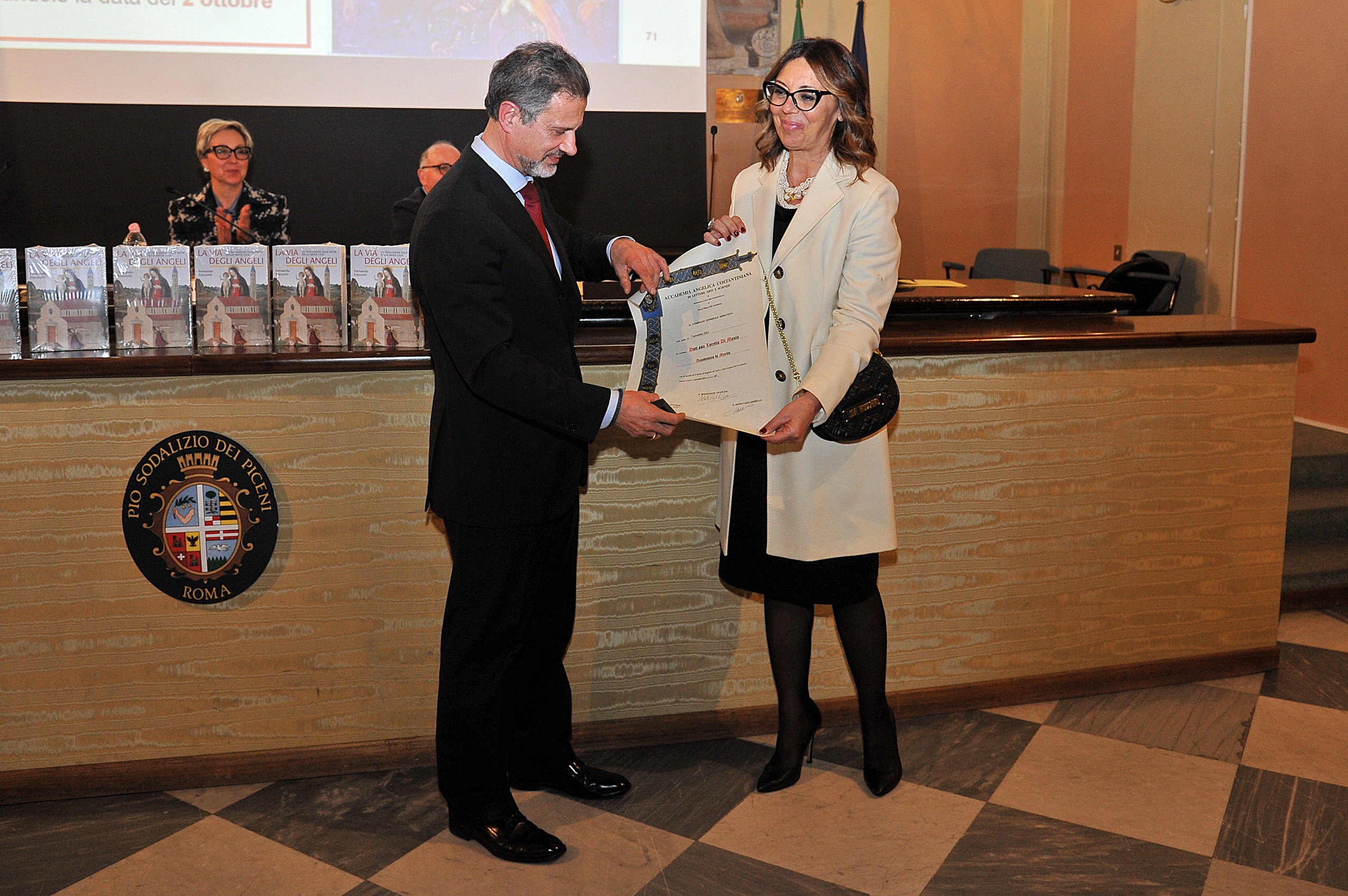 il Presidente dell'Accademia p.pe Alessio F. Angelo-Comneno di Tessaglia consegna il Diploma all'Accademico di Merito, dott.ssa Loretta Di Maulo