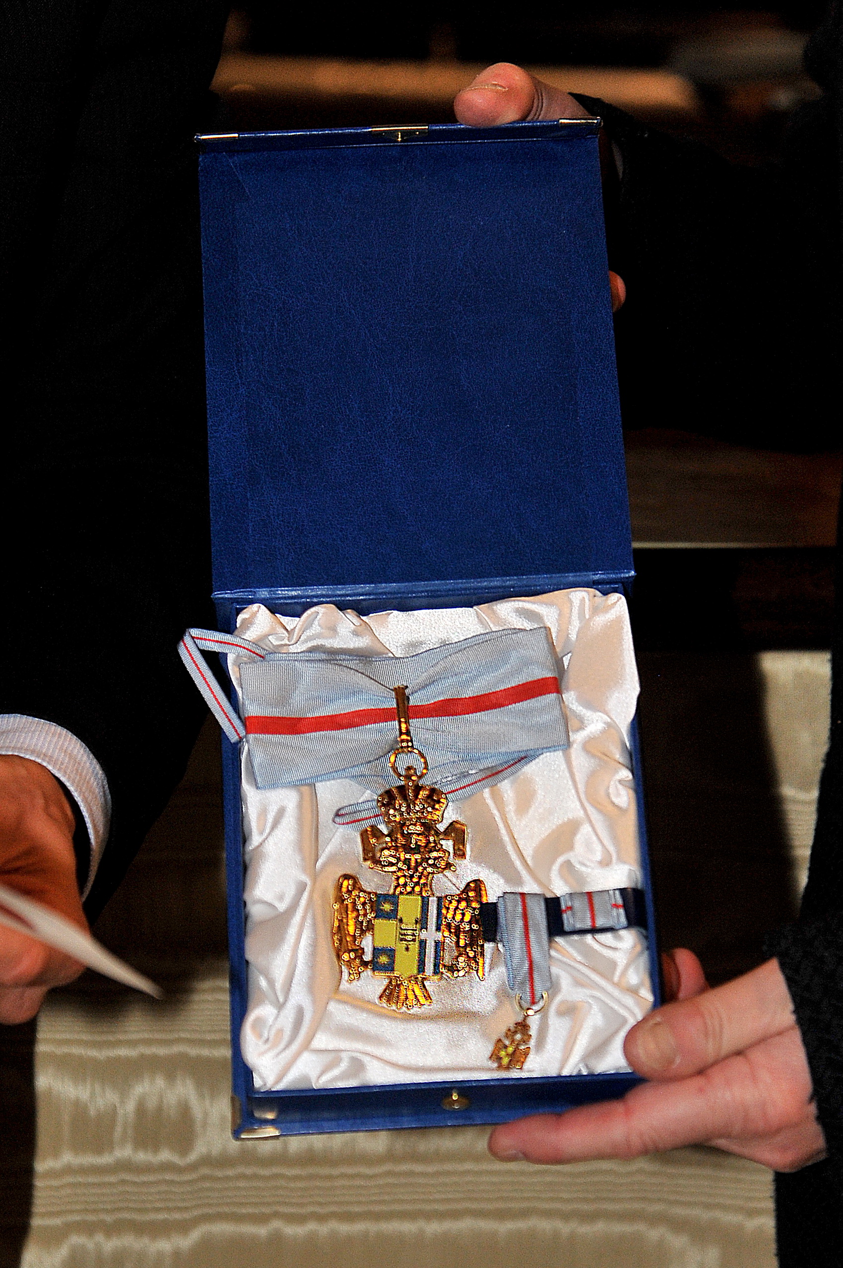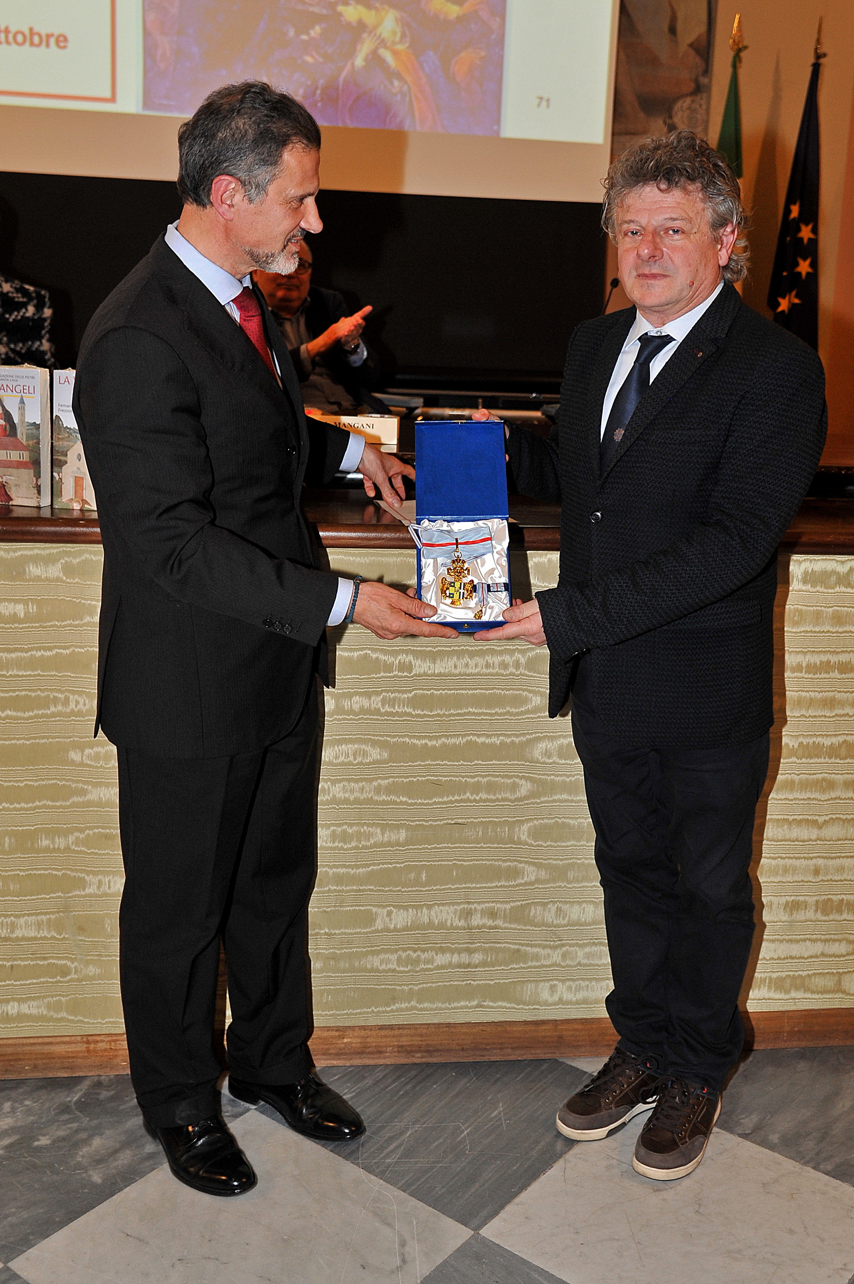 il Presidente dell'Accademia p.pe Alessio F. Angelo Comneno di Tessaglia consegna all'Accad. di Merito Fernando Frezzotti la Medaglia d'Oro di Benemerenza della Casa Angelo-Comneno di Tessaglia e d'Epiro