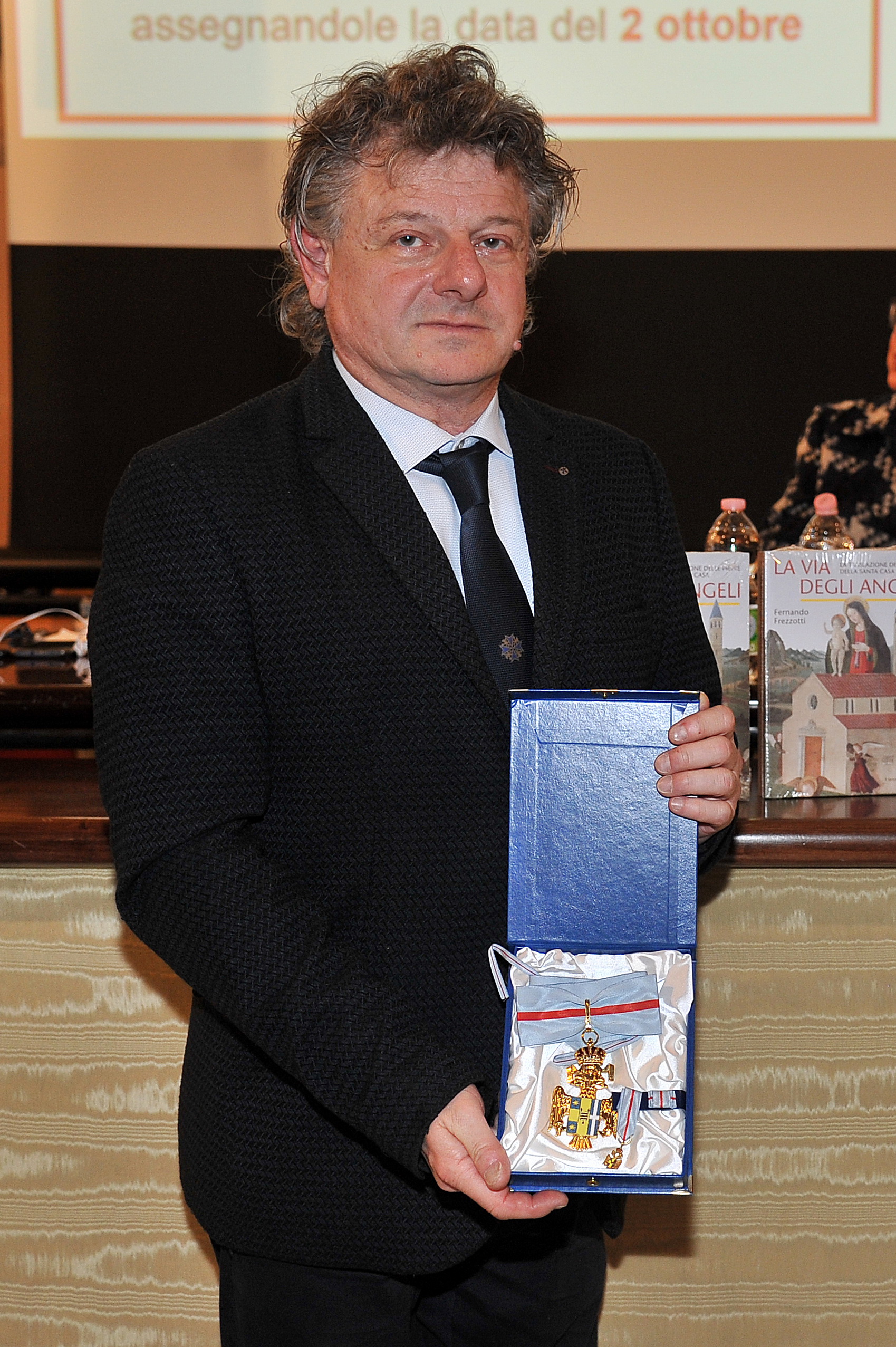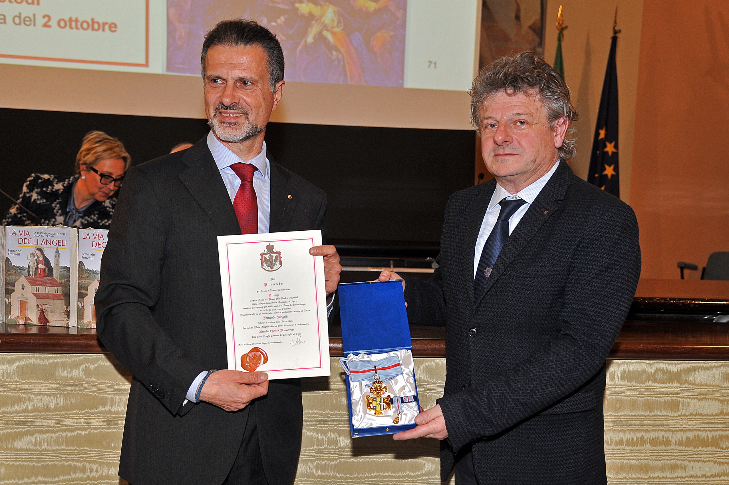 Il P.pe Alessio F. Angelo Comneno di Tessaglia consegna all'Accad. di Merito Fernando Frezzotti la Medaglia d'Oro di Benemerenza della Casa Angelo-Comneno di Tessaglia e d'Epiro per i decennali gli studi condotti sulla Santa Casa.